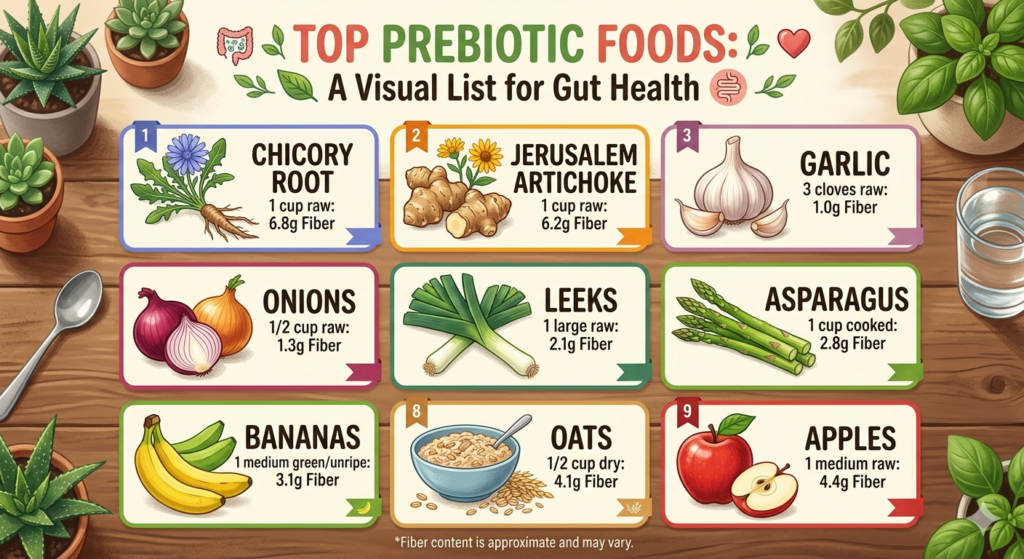 One thing to keep in mind is that prebiotic foods can cause temporary gas or bloating when you first increase intake. That’s normal. Start small one serving per day and increase gradually over two to three weeks.