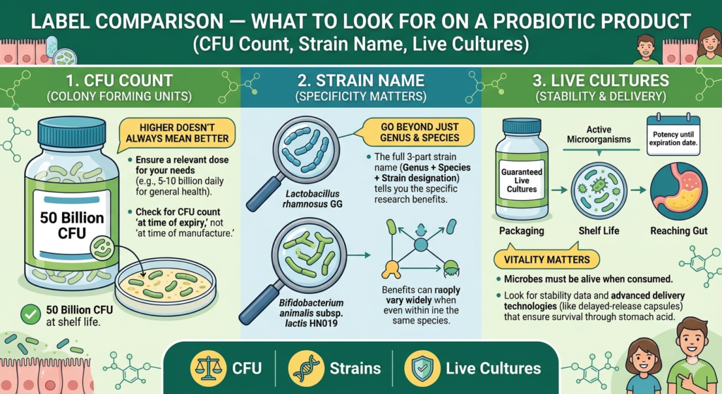 | Probiotics (food) | General digestive support, variety | Natural delivery, multiple strains at once | Strain amounts inconsistent across products |
