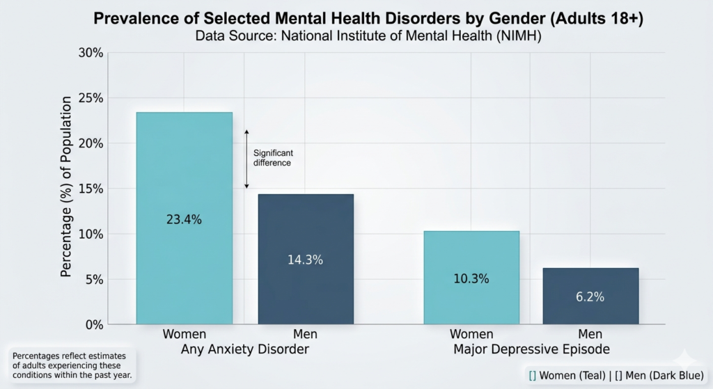 Anxiety is the most prevalent mental health condition in America. Women experience it at a rate of 23.4%, compared to 14.3% in men nearly a 10 point gap, per NIMH data compiled by The World Data, 2025. Depression follows the same pattern.